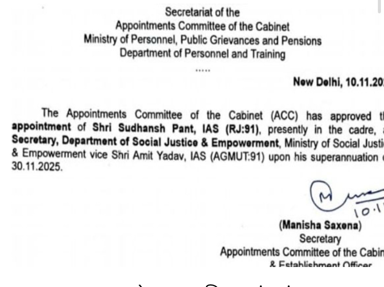 Rajasthan chief secretary Sudhansh Pant will have to step down from his post in between following his appointment at secretary, department of social justice and empowerment. Pant is scheduled to join the new post on December 1, 2025 filing superannuation of existing secretary and his batch mate Amit Yadav (1991 batch) of AGMUT cadre. Pant is due to retire in February 2027.