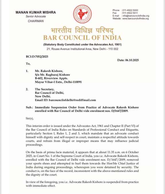 Rakesh Kishore, the 71-year-old advocate, who threw a shoe at Chief Justice of India B R Gavai on Monday inside the Supreme Court, has been suspended from practice worn immediate effect.