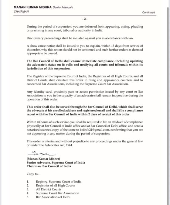 Taking a strict action, the chairman of Bar Council of India Manan Kumar Mishra issued interim suspension order under the Advocates Act, 1961 and Chapter II (Part VI) of