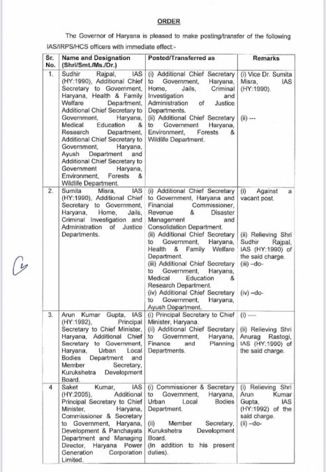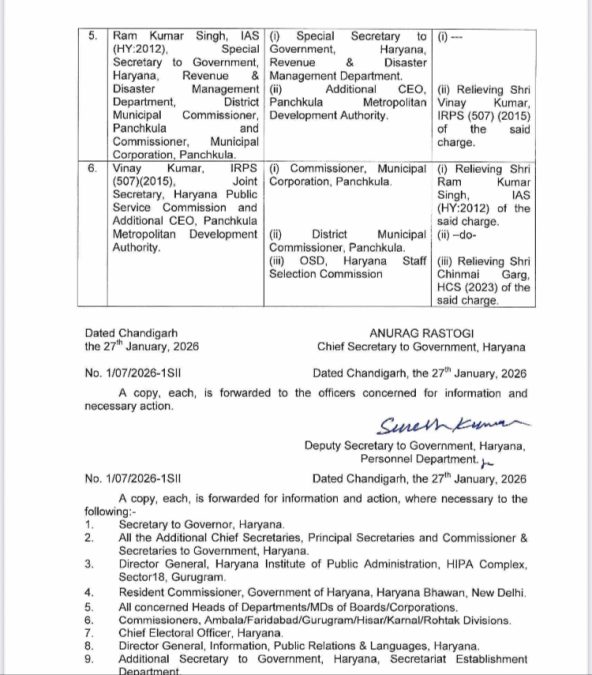 Besides, Vinay Kumar, joint secretary of Haryana Public Service Commission, has been made commissioner of Panchkula Municipal Corporation. He will also handle the additional charge of District Municipal Commissioner of Panchkula and OSD in Haryana Staff Selection Commission.