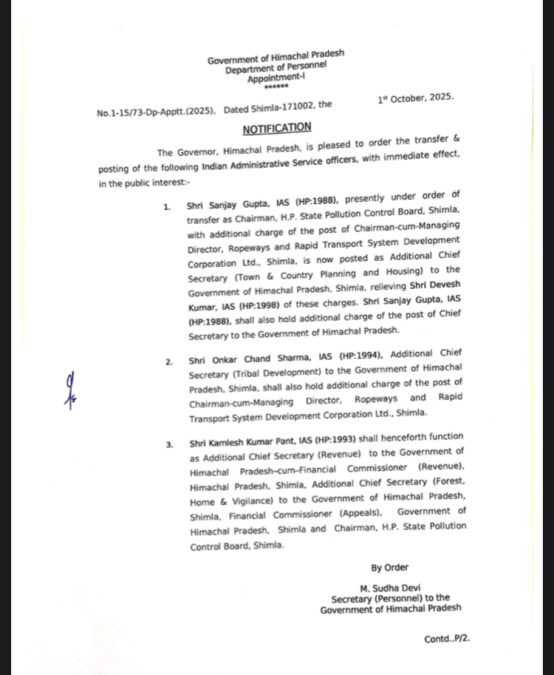 The post fell vacant on September 30, 2025 after Prabodh Saxena retired from the post of chief secretary. Saxena, after retirement, has been appointed as chairman of Himachal Pradesh Electricity Board for three years.