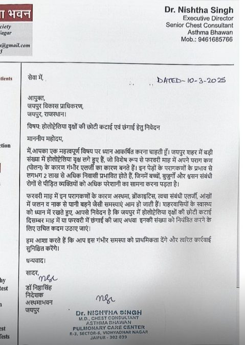 According to the representation sent to JDA, Dr Nishtha Singh has drawn attention to pollen allergy which could affect more than 2 people suffering from pulmonary diseases including Bronchitis and Asthma. The pollen allergy also causes irritation in eyes and skin.