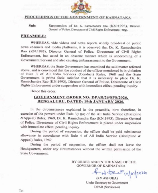 The DGP's suspension order said, “Rao behaved in an obscene manner which is unsecent for a government employee and it has also embarrassed the government. The state government is prima facie satisfied that till the investigation is pending, DGP Dr. K. Ramchandra Rao needs to be suspended with immediate effect”.