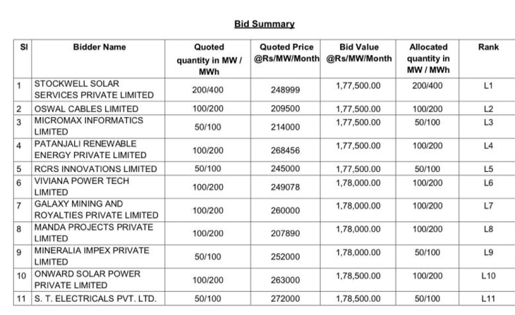 The bid received strong participation from multiple developers, indicating the growing interest in battery energy storage linked with renewable energy. As many as 11 companies were successful in bidding process. Among the bidders, five companies quoted the lowest tariff and became the L1 bidders. Stockwell Solar emerged as the largest winner with 200 MW/400 MWh capacity at a tariff of ₹1.775 lakh per MW per month. Oswal Cables also quoted the same tariff for a 100 MW/200 MWh capacity, while Micromax Informatics secured 50 MW/100 MWh at the same rate. Renewables and RCRS Innovations matched the lowest tariff with capacities of 100 MW/200 MWh and 50 MW/100 MWh, respectively.