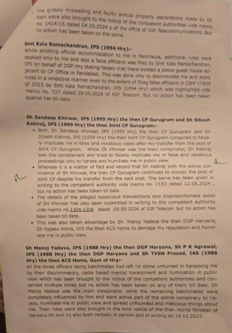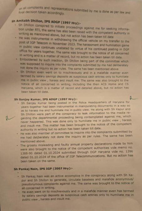 The 8-page suicide note has names of senior officers –  Anurag Rastogi, Chief , Shatrujeet Kapur, DGP, TVSN Prasad, former CS, Rajeev Arora, former ACS, Manoj Yadava, former DGP, PK Agrawal, former DGP, Sandeep Khirwar, ADGP, Amitabh Dhillon, ADGP, Sanjay Kumar, ADGP, Kala Ramchandran, Principal Secretary, Mata Ravi Kiran, ADGP,  Pankaj Nain IG, Kulwinder Singh, IG, Narendra Bijarnia, SP.