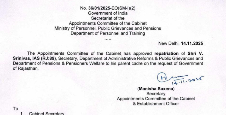 V Srinivas, a 1989 batch officer, who is serving as Secretary in Department of Administrative Reforms, Public Grievances and Pensions at centre, has been repatriated to home cadre Rajasthan. He is all set to replace Rajasthan chief secretary , who is going back to centre to serve as secretary in the department of social justice and empowerment.